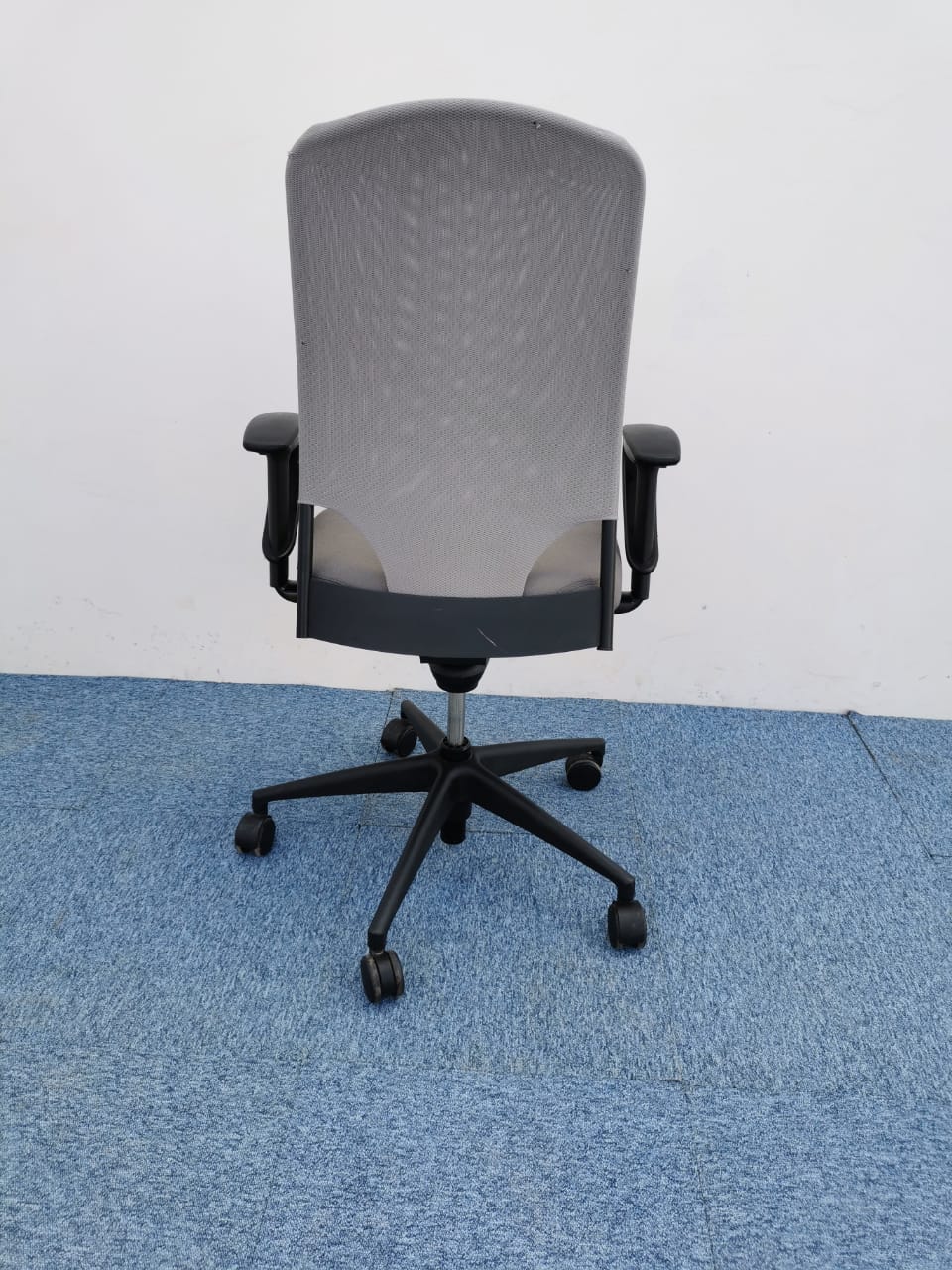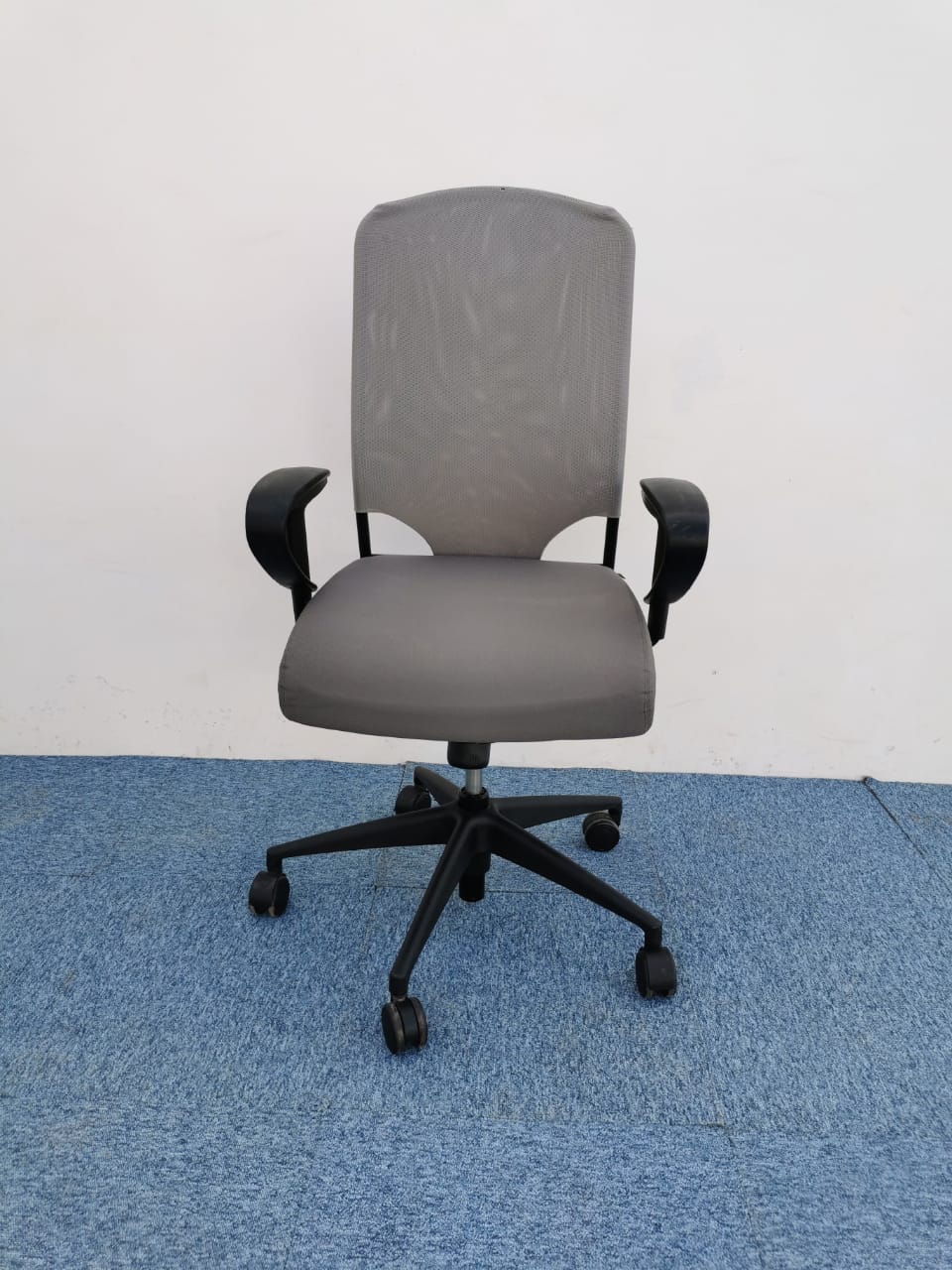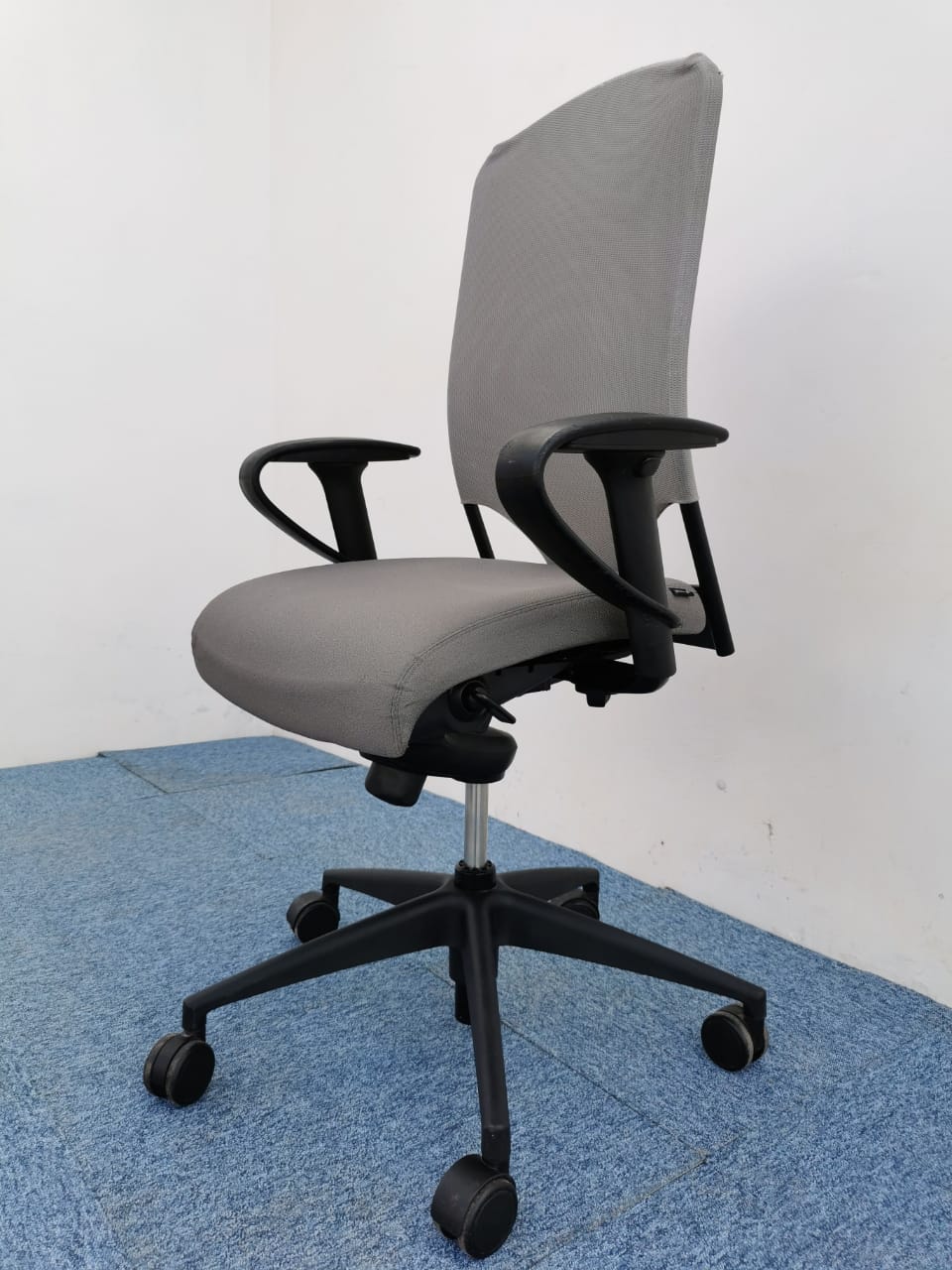 tissu gris clair ,avec accoudoirs réglables en hauteur et en largeur