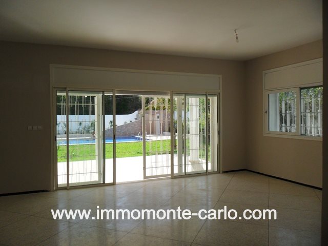 Location Souissi Rabat villa entièrement rénovée avec piscine, chauffage central et climatisation, un jardin bien entretenu, un garage et puits, composée de double salons européens avec cheminées, un séjour, chambre d’amis avec salle de bain, belle terrasse donnant sur la piscine et le jardin, salle d’eau des invités avec lave main et une cuisine, buanderie, débarras, logement de personnel à l’étage : suite parentale avec salle de bain et dressing, 3chambres avec deux salles de bain, terrasse et balcons,… Pour plus d’informations ou visite n’hésitez pas de contacter notre agence immobilière Immo Monte-Carlo au N° de tél: +212661464037/ +212661212547ou Tél/Fax: +212537755043 ou par E-mail : immomontecarlo@gmail.com ou visitez notre site www.immomonte-carlo.com ou rendez-vous à rue Dayet Aoua, Imm.2, Apt.3, Agdal RABAT MAROC.